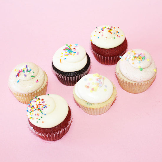 The perfect sampler box to share with your friends and family (or keep all to yourself!) of our best selling cupcakes! Choose from our delicious assortment of flavors - all finished with a swirl and accented with festive sprinkles!