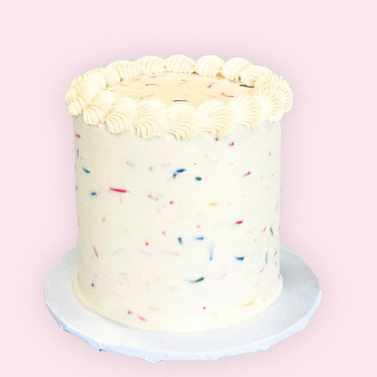 Our beloved 4” mini cake is back for a limited time! Four layers of cake, three layers of filling, and the perfect size to make someone smile, or keep all to yourself! All cakes are finished in white sprinkle buttercream and accented with a piped border.